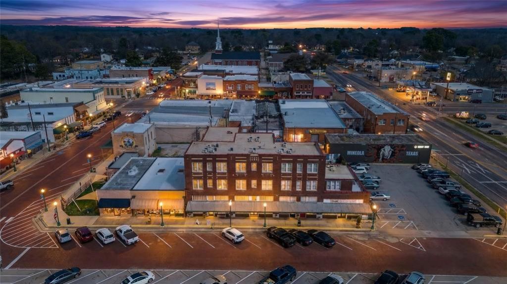 The Mineola icon, finally available. This 3 story boutique hotel, anchored by 2 flagship commercial spaces is positioned to shape the landscape of historic downtown Mineola. Occupying a prominent location on Commerce Street, it is front row for annual events. The lobby awes with soaring ceilings, lit by curated chandeliers, highlighting the original terrazzo floor. The adjacent hallway leads to the hideaway cigar lounge, a coffee shop, anchored by a salon.Walk through the shaded courtyard out back that boasts a covered grill, restrooms, & abundant seating under stars for evening concerts that draw in guests and weekenders. French doors open to the Liberty Lounge, a popular library and game-playing space, or those who wish to rent a private meeting space. Tucked behind are cozy caretaker quarters, laundry utlilties and a professional kitchen, with alley access. Head next door to the additional anchor space that boasts a 2nd commercial kitchen, wine bar and bespoke office-gallery totaling 2500 sq ft. The original staircase opens to the mezzanine with a peekaboo view to the reception area before leading to the ballroom. Past an original coast check, and anchored by a piano,185 guests can be accommodated.This space lends itself naturally to hosts who require an event space for their weekend retreats. Wing one of the 2nd floor currently offers 4 finished rooms, 2 bathrooms, modest office, and storage room. The adjoining wing offers an opportunity space, ready for a finish out for future owner's custom apartment, with some original tile, brick interiors,ubiquitous high ceilings and exposed beams. The cherry on top is the 3rd floor. A collection of 13 rooms and 7 bathrooms, each with its own personality, featuring sumptuous mattresses, exposed brick interiors, individual climate-controlled units, and rooftop access. Ideal for tastemakers or entrepreneurs seeking a distinctive downtown building with character and endless potential for the ultimate work life creative space.