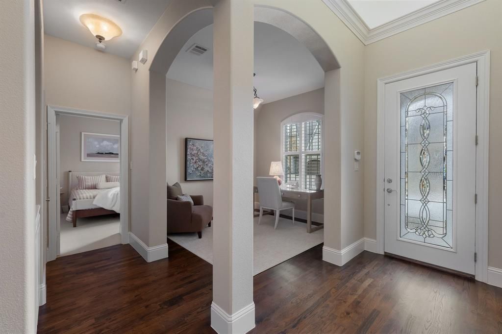 Sophisticated. Built to impress. Designed for extraordinary value and an elevated lifestyle. Hidden away in the charming, ultra-private & gated community of Cambridge Gate in North Dallas, 6166 Stapleford Circle is a true single-story 3-bedroom home, a rare find in the community.Original owners, incredibly maintained, and customized with the builder to add the extra bells and whistles. With abundant natural light, sky-like ceilings, perfectly refinished hardwood floors, and an effortless flow, this home is designed for elegance & ease. The large, open living area, dining room, and completely renovated kitchen are seamlessly complemented by custom cabinets & built-ins, high-end SS appliances, 5-burner gas cooktop, custom vent hood, and beautiful Quartz counters. The large living room and custom stone fireplace overlook the pretty side yard and patio, just right for morning coffee or tranquil evenings. A relaxing primary suite with seating area beckons you to unwind in style, with a vaulted ceiling and peaceful views to the side patio. A spa-like bath, long double vanity, soaking tub, separate shower, and an enormous 3-tier closet complete your retreat. Two additional large bedrooms and two generous bathrooms up front are separate and perfect for guests, plus a dedicated office sits between the bedrooms with pretty views to the front. Here, maintenance is a breeze, with a lifestyle of simplicity, quality, flexibility, and privacy. A recently replaced HVAC will help ensure you're comfortable year-round. Cambridge Gate is an exclusive enclave of only 55 homes with beautifully manicured lawns and green spaces, offering a peaceful, secure setting where luxury and casual elegance blend seamlessly. Great neighbors and neighborhood events will help you easily feel at home. Convenient to shopping, outstanding restaurants, Trader Joe’s, Whole Foods, Central Market, GB-190, Tollway, and the best that North Dallas has to offer. It’s simply unmatched!